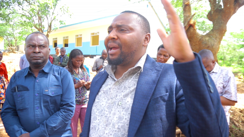 Mhe Junjulu Ndete Muhewa Diowani wa kata ya Sangambi akitoa salamu za wananchi wa kata ya Sangambi kwa kamati ya Fedha, Utawala na Mipango wakati ilipotembelea mradi wa ujenzi wa Shule ya Awali na Msingi inayojengwa kwenye eneo la Shule ya Sekondari Sangambi